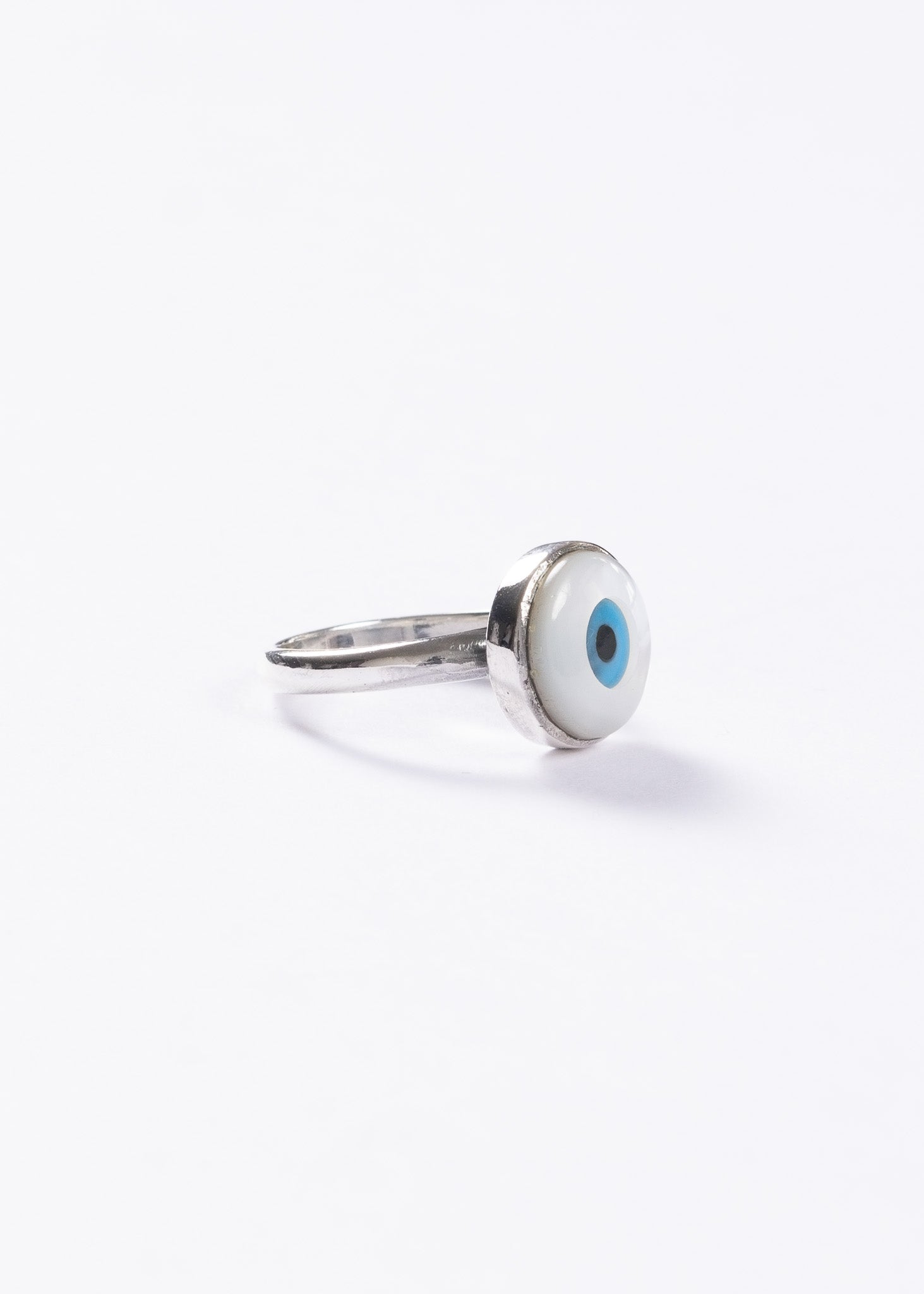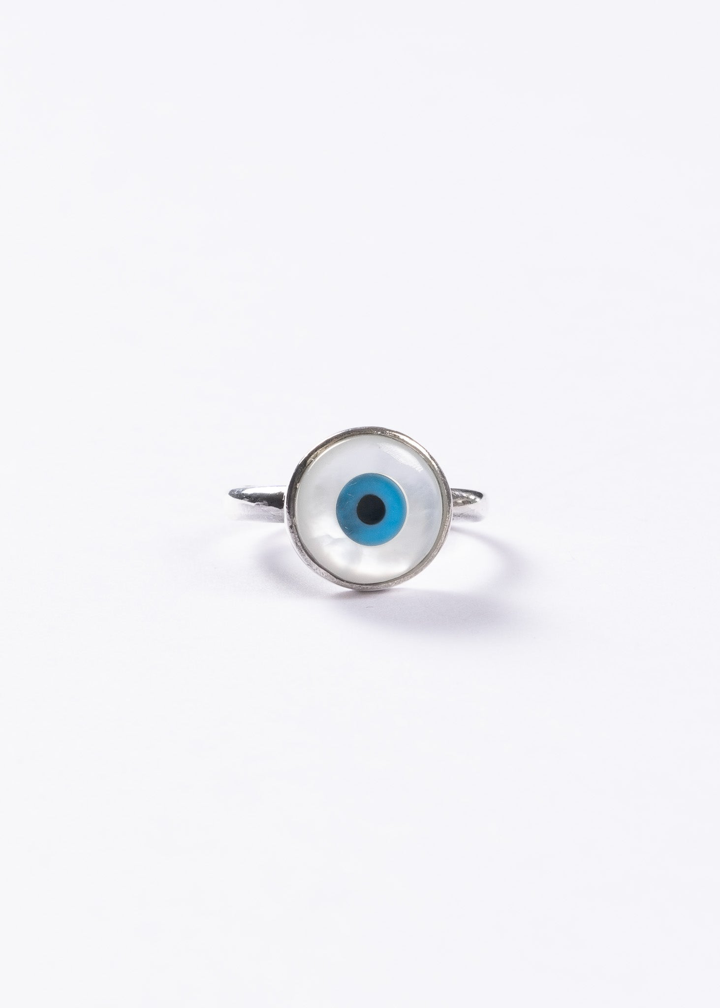 Anillo elaborado en plata 925 de alta calidad, con un diseño central que incorpora un ojo turco celeste, símbolo ancestral de protección contra las energías negativas y el mal de ojo.