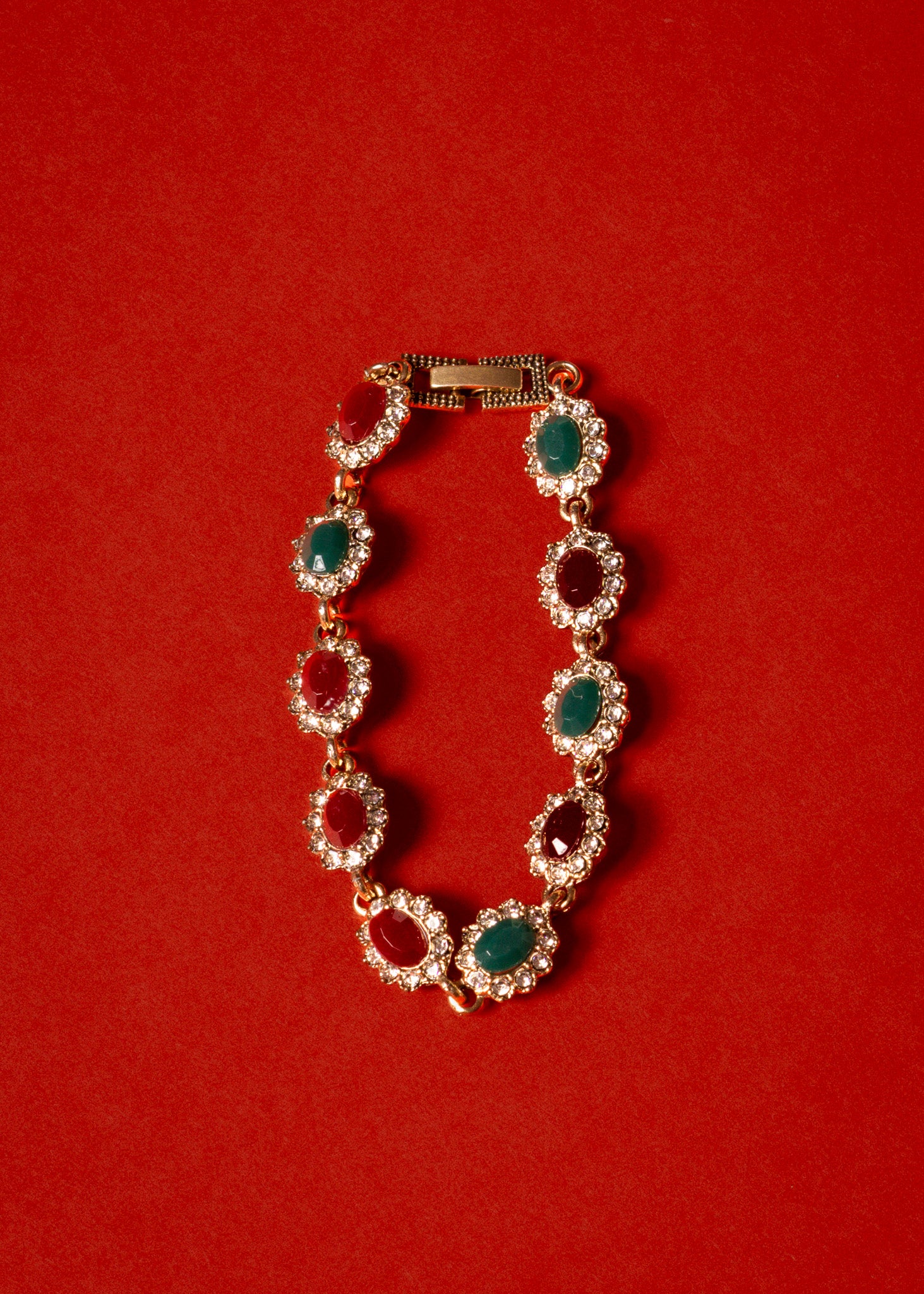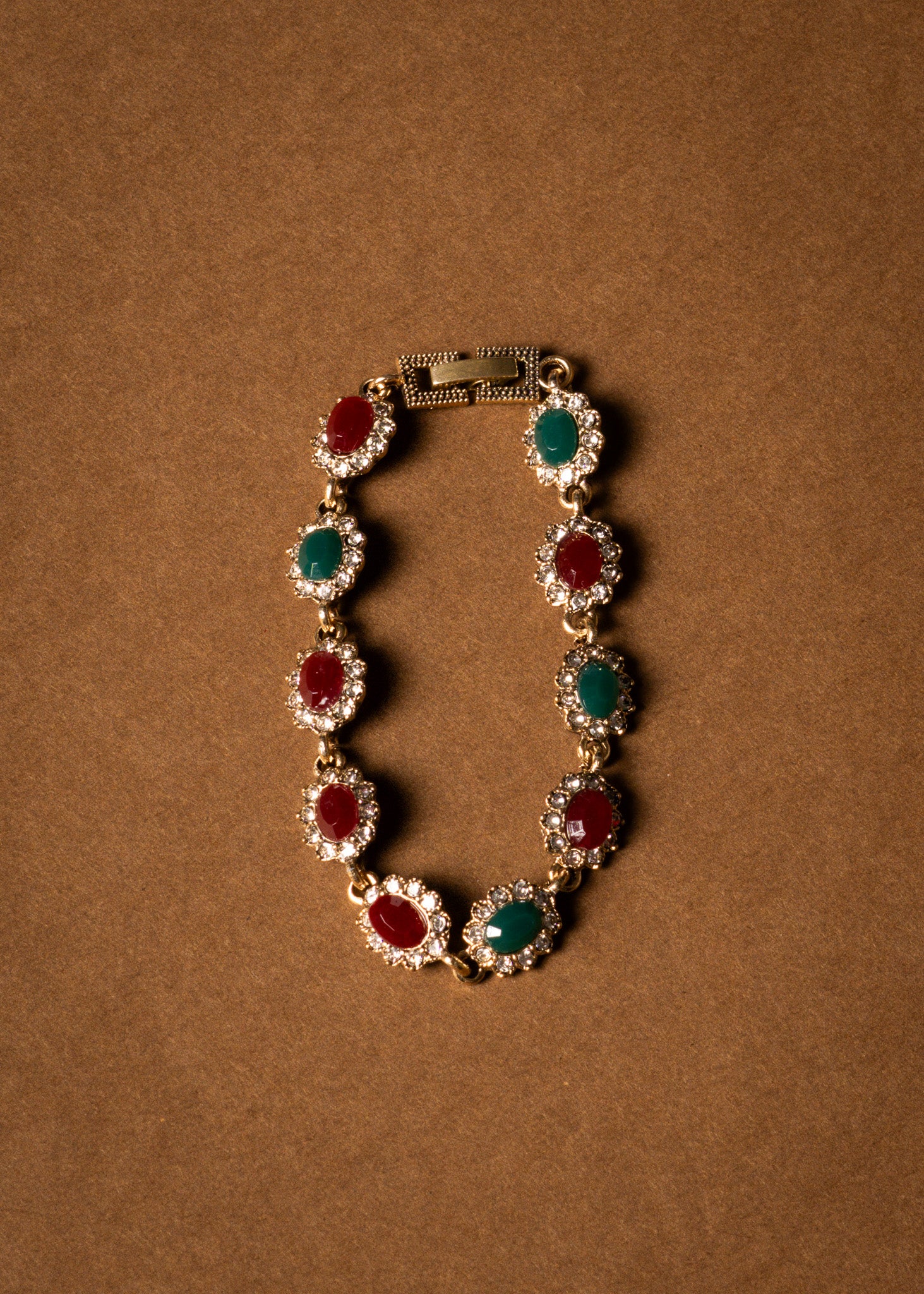 Elaborada en bronce real, esta pulsera destaca por sus cristales de color engarzados en delicadas formas florales, evocando un estilo vintage y sofisticado.