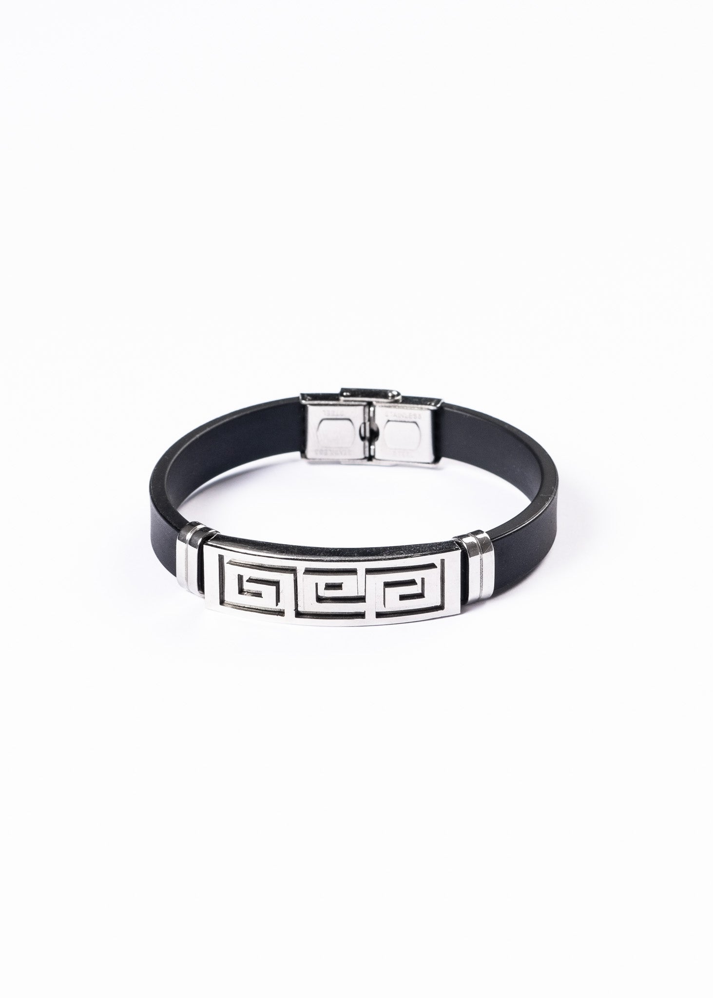Pulsera con malla de goma y frente metálico con diseño griego.