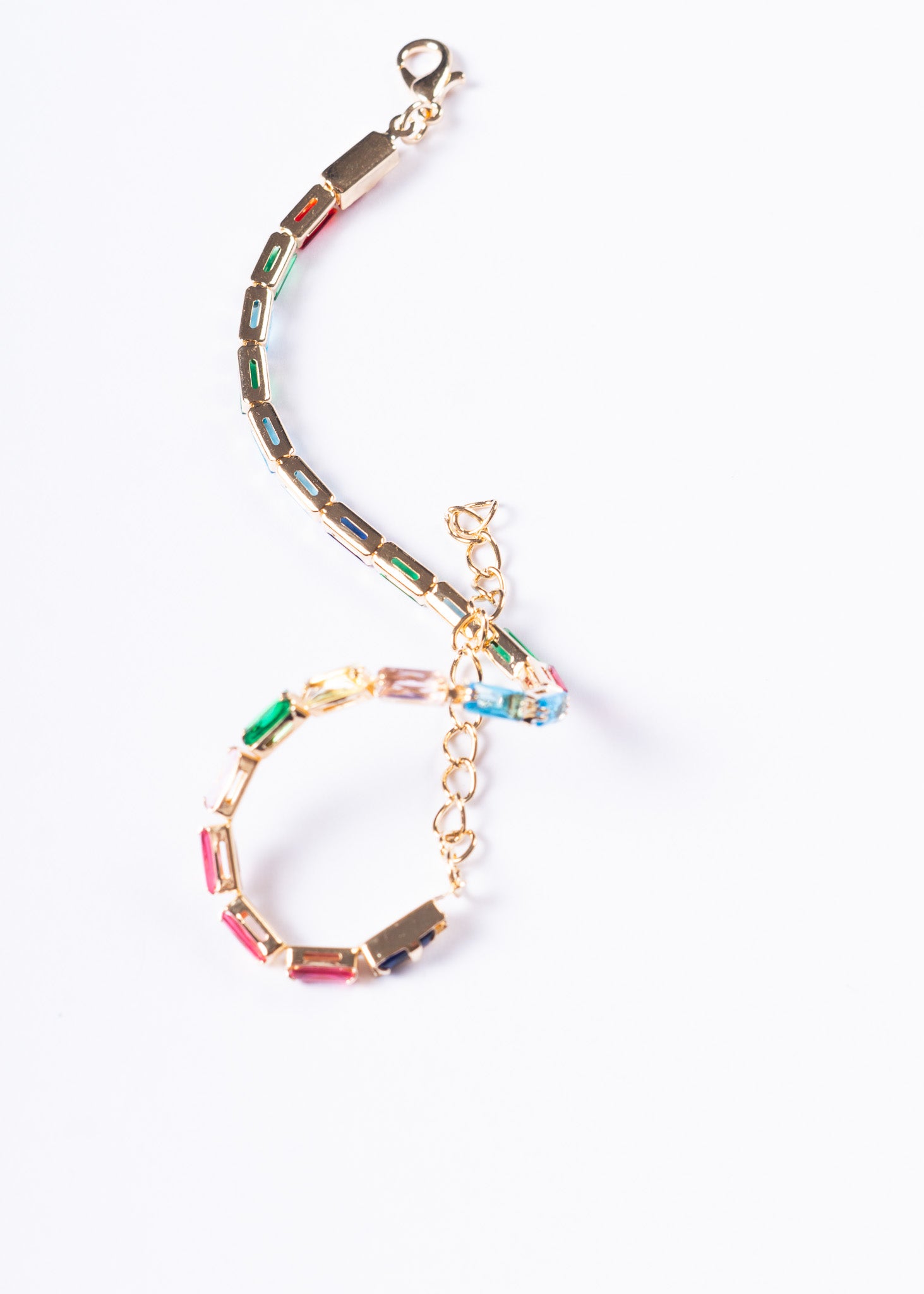 Pulsera tennis recta con terminación de zirconias multicolor.